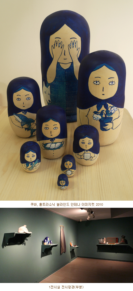 2층은 1층의 조그만 접시에 들어 있던 쿠바가 다른 쿠바의 접시에 우연히 옮겨졌을 때, 튀었을 때의 상상입니다. 개인으로서의 쿠바, 나 하나만의 쿠바가 아니라 또다른 쿠바, 즉 모든 사람 안에는 쿠바라고 하는 것들이 있다는 가정입니다. 모두 그것을 가지고 있지만, 표출하지 않을 따름이라고 작가는 생각합니다. 우리나라의 3․1독립선언문 내용에 따르면, '방촌(方寸)의 인(刃)을 회(懷)'하고 있는 것이지요. 이른바 지배 계급에 의해, 결코 표면 위로 드러내지 못하고 수면 아래에 조용히 있을 따름이라는 겁니다. 그러나 세상에 존재하는, 특히 사랑스런 아내들이 작은 쿠바를, 작은 바다를 마음 속 깊이 품고 있다는 것을 박화영은 보여줍니다.