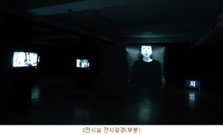 2층 전시의 컨셉은 '틀린 번호, 잘못 남겨진 메시지'입니다. 마치 푸른빛 혁명의 피, 바닷물이 튀어서 전혀 다른 상황의 빈 접시에 전이된 것처럼, 존재로서의 양극을 보게 될 것입니다. 그래서 박화영은 잘못 남겨진 메시지에 열심히 립싱크를 했습니다. 그것을 대형 화면을 통해 직접 듣고 보실 수 있습니다. 이것이 2층 전시의 핵심입니다. 일상적인 이야기입니다만, 박화영은 잘못 전달된 대화를 다른 맥락의 전혀 이상한 대화로 비틀어 전달하고 있는 것입니다. 쿠바의 기운이 느껴지십니까? 한편 5대의 모니터를 통해 박화영은 군중 사진들을 보여줍니다. 군중들 사이에서 또다른 쿠바들을 찾아 리서치하고 다니는 것이지요. 다른 존재들, 이 세상에 쿠바는 단 한사람만이 아니라, 저들 안에 또다른 쿠바라고 하는 존재들이, 여기저기에 있음을 암시를 하는 작업입니다. 이 사람이 쿠바일까, 저 사람이 쿠바일까 하는 박화영식 스캐닝들이 출몰합니다.