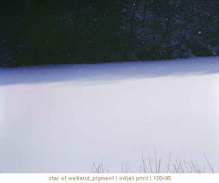 그의 사진들에서 표현은 그야말로 최소화되어 있고 사물들은, 작가 본인이 그렇게 부르듯이, 한 폭의 수묵화처럼 전개되어 있으며, 호수나 강물, 들과 산들은 마치 이미 신화속의 전설로 후퇴해 버린 에테르(ether)에 잠겨 있는 듯 보인다. 하지만 그 습지는 전설이나 신화가 아니고, 실재하는 현실이며, 생명계의 지속성을 담보하는 균형자라는 현실에, 우리는 눈을 뜨게 된다. 그래서 더더욱, 그 자연이 매우 리얼하면서도 그 반대로 매우 추상적이라는, 두 개의 상반된 리얼리티 사이의 경계점에 서 있는 자신을 발견하게 되는 것이다.