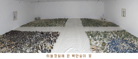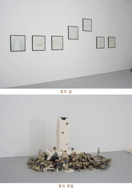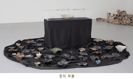 흙이 빚어져 구워진 형태가 꽃이든, 컵이든 접시든 주전자든 국그릇 밥그릇이든, 그것은 질료의 일차적 운명이고, 동시에 일차적 운명은 깨어져서 본연으로 돌아가는 긴 여정에 이를 수밖에 없기 때문이다. 이번 작업의 한 부분이 깨어지고 우그러지고 비틀어진 파편을 오브제로 삼은 이유도 그 때문이다. 또한, 3년 전부터 지속적으로 만들어온 꽃은 형태로서의 꽃이 아니다. 보이지 않는 영혼이 물화(物化)된 것이다. 때문에 ‘꽃의 무덤’ ‘꽃의 부활’(이층 전시장)을 ‘하늘 정원에 핀 백만 송이의 꽃’(아래층 전시장)으로 연결시킨 것은 화가의 작업이 ‘그림을 그리다’에서 ‘그림을 잃다’ 라는 명제로 이동했음을 말해주고, 그것은 동시에, 땅과 하늘, 소멸과 생성, 죽음과 삶의 거대한 환(環)의 어느 자락에 그의 작업이 위치하고 있음을 나타낸다고 하겠다.