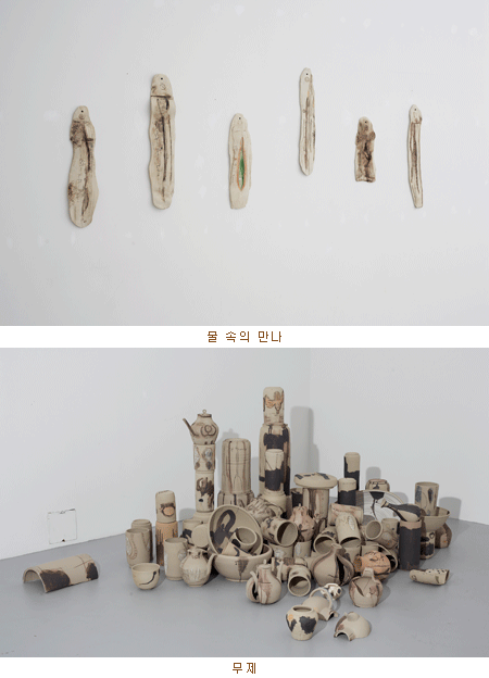 이번 전시회는 5년 전부터 근무지에서 학생들에게 도자기 수업을 하게 되면서 흙을 입체적 종합적으로 접할 수 있는 여건이 마련된 것이 계기가 되었다. 이전의 흙 작업이 평면 작업인데 비해, 가마가 있음으로 해서 ‘빚어서 구을 수 있는’ 조형작업을 할 수 있게 된 것이다. 흙의 부드러운 속살을 치대고 뭉치는 동안, 이전의 오브제에서는 결코 느끼지 못한 밀착된 감각의 황홀을 체험하게 되었고, 그것은 우주적 깊이의 사유를 가능케 했다. 작가는 흙이 빚어내는 일차적 방정식에는 별 관심이 없다.