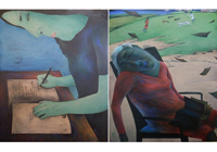 작가는 사랑, 거짓, 그리움과 슬픔 등 병약하고 여린 눈에 비친 현실세계를 그려냄으로써 자신의 깊은 상념을 캔버스에 기록합니다. 더불어 작품 안에는 이 모두를 감성적으로 품어낼 수 있는 따스함 또한 담고 있습니다. 연탄이라는 재료를 아크릴물감과 함께 사용함으로써 독특한 작가만의 변형된 색을 가지고 있으며, 이 재료가 가진 독특한 표현방식은 작가의 이야기와 감수성을 표현 그대로 강렬하게 잘 전달하고 있습니다.