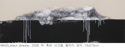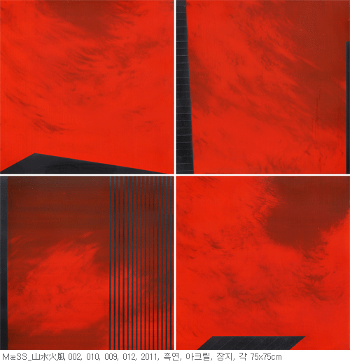 불의 정신분석 2010년까지 선 보였던 MæSS 연작이 주로 ‘한 덩어리 의식’이라는 주제에 초점을 맞춰 인간과 자연의 공생관계를 생성, 소멸, 변화, 순환하는 우주자연의 기본 원리에 입각하여 시각조형언어로서 탐구하였다면, 이번 MæSS_山水火風 연작은 이러한 사상을 근간으로 하되 地. 水. 火. 風이라는 사대요소를 도입하여 각 요소를 인간의 본성과 연계하여 좀 더 정신분석학적 측면에서 접근하고자 하였다. 예를 들어, 이번 작업에서의 두드러진 변화는 붉은 색의 전면적 사용이다. 붉은 색은 불과 열을 의미한다. 체온이 일정 수준 이하 또는 이상일 경우 인간은 죽는다. 그러므로 열은 실체의 풍부함과 영속성을 말해주는 대표적인 증거이자 생의 강도, 존재의 강도를 파악할 수 있는 척도이다. 불은 인간의 감정 중 뜨거운 감정, 즉 본능, 욕망, 욕구 등과 관련이 있다. 무언가 원초적인 것과 현실적인 것과의 충돌이 존재한다. 10여 년간의 외지에서의 삶을 접고 귀국한 지 어느새 2년. 물리적 공간의 이동은 심리적, 정신적 변화를 필연적으로 수반하고, 이로 인한 또 한 번의 내적 혼란과 분열, 그리고 재귀현상을 체험한다. 마치 오랜 시간 사유공간에서 떠돌다가 이제야 비로소 땅에 발이 맞닿는 현실공간으로 들어 온 느낌이다.