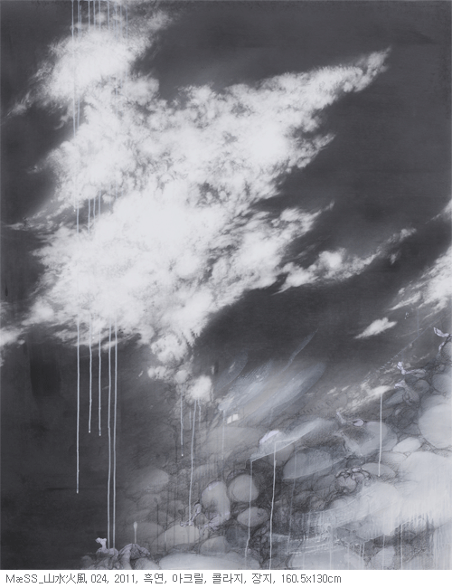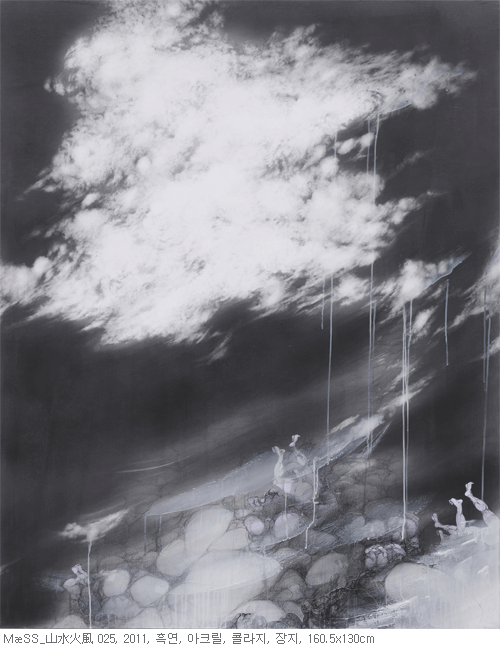 MæSS 연작에 관한 연구 MASS & MESS MæSS는 최근 몇 년간 진행 중인 회화작업의 주요 타이틀이자 핵심주제이다. MæSS는 1) mass(군중/다수/덩어리)와 2) mess(혼란/카오스/엔트로피)의 합성어로 의미는 서로 다르나 발음이 같은 단어이다. 이는 기표의 다중적 해석(multiple interpretations)을 꾀하기 위한 의도적인 장치로써 인간을 포함한 우주 자연의 ‘한 덩어리 의식(oneness)’을 중심주제로 삼는다. 山水火風은 부주제로서 이번 전시를 통해 새롭게 연구하고 있는 소재이자 주요 개념을 함축하고 있는데, 이 또한 이중적 해석이 가능하다. 첫째는 동양예술의 진미인 1) 山水畵 양식을 의미하고, 둘째는 불가사상에서 말하는 인간과 우주를 구성하는 사대요소인2) 地. 水. 火. 風을 의미한다. 이번 “MæSS_山水火風”展은 이전 작업에서 주로 다뤄왔던 萬物制動과 萬物流轉 사상을 바탕으로 하되 좀 더 심도 있게 연구하기 위하여 ‘산수화풍’이라는 구체적인 개념을 도입하였다.