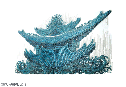 뉴욕에서 단추와 핀을 통해 독특한 작업을 선보여 왔던 황란의 경우는 플렉시 글라스 2작품을 앞뒤로 설치하여 앞뒷면 양쪽에서 입체적으로 보이게 한다. 그의 작업은 핀과 단추가 만들어내는 사이 공간이 중요 포인트다. 특히 두개의 요소 사이에서 형성되는 공간과 그림자의 관계는 독특한 일루젼을 만들어냄으로써 감상자들의 호기심을 자아낸다. 특히 이번 작품에서는 전통 사찰의 기와지붕 이미지를 모티브로 하는 레이어 작업을 선보이는데, 감상자의 눈을 앞뒤로 오가게 하여 독특한 시각적 놀이를 제안하고 있다.