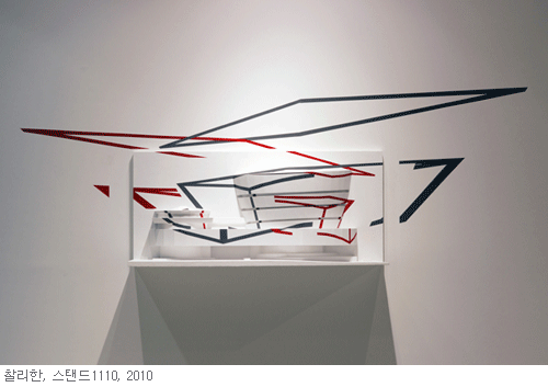 찰리 한은 공간자체를 캔버스 삼아 독특한 시점 작업을 하고 있다. 그의 공간해석 속에는 건물의 내․외관, 인테리어, 마감재 등 건축적 요소가 골고루 포함되어 있다. 따라서 공간의 구획, 동선 등이 작업반경 속에서 고려되어야 한다. 특히 이번 전시를 위해 그는 미술관 로비와 전시장 내부 일부 벽면을 작업반경으로 삼았다. 그의 작업은 선과 면을 이용한 테이핑 작업을 보여주는데, 관람자는 예상하지 못한 곳에서 공간이 연결되거나 혹은 끊어지는 경험을 얻게 되는 시각적 일루젼을 보여주어 관람자들을 어리둥절하게 만든다.