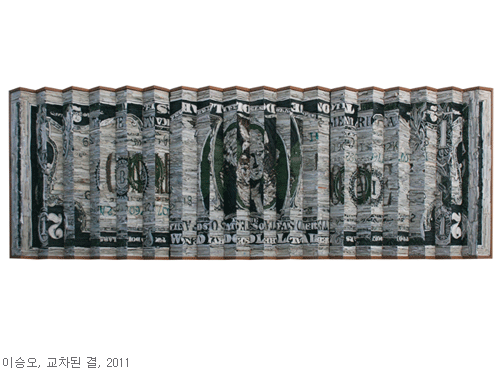 각종 종이의 단면을 이용하여 독특한 레이어 작업을 보여주는 이승오의 작업은 이중이미지 효과를 극대화하고 있다. 이번 전시에서 그는 세계 경제의 상징적인 의미로서 달러를 그 모티브로 삼았다. 지폐가 가진 양면성, 화폐를 바라보는 인간의 눈이 고스란히 그의 작업 속에 담겨있다. 특히 그는 바라보는 시각에 따라 화폐의 형상이 달라지게 만든다. 즉, 한쪽에서는 1달러, 다른 방향에서는 2달러가 보이도록 만들어 눈의 착시감과 리듬감을 만들어내도록 유도하고 있다. 종이의 두께감과 화폐가 주는 기묘한 만남은 현대사회와 부, 혹은 그 반대를 생각하게 하는 이중적 고안물임을 작가는 말해주고 있다.