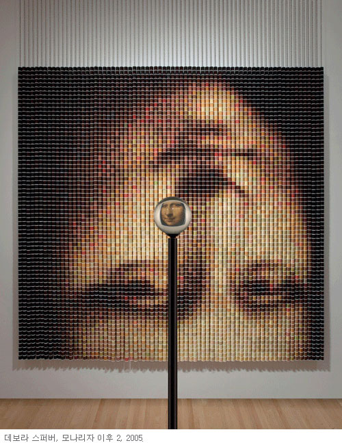 데보라 Devorah Sperber에게서는 먼저 그가 사용하는 재료에 관심을 기울여야 한다. 그는 실패를 오브제삼아 독특한 설치작품을 선보인다. 수 천 개 혹은 수 만 개의 실패를 사용해서 추상적인 배열을 보여주는데 아크릴 구체(광학장치)를 통해 볼 때 뚜렷한 형상을 만날 수 있다. 이 장치는 인간의 눈과 뇌와 같은 기능을 한다. 데보라는 데이터의 수집, 분류, 배열, 정리, 기술적 가공, 연출, 그리고 육체의 반응을 종합적으로 고려한다. 전시장벽에 그의 작품은 거꾸로 설치되어 있다. <모나리자>, <진주귀걸이를 한 소녀>, <대사들>에 이르기까지 그가 구사하는 모티브는 거장들의 작품 혹은 작가초상을 대상으로 한다. 실패의 조합은 모호하고 추상적인 느낌만 가져다주지만 광학장치를 통해 바라보는 그 형상은 완벽하다. 이는 우리 눈이 이미지를 망막에 투사하고 그것은 다시 뇌에 의해 교정되어 인식된다는 점에 착안한 것이다. 그의 실패 하나하나는 일종의 픽셀과 같이 작동하며, 관람자들은 경이의 순간을 맞이한다. 그는 노동집약적인 반복성이라는 전통적인 수공적 방식과 디지털 기술이 주는 효과를 동시에 구현한다. 뉴욕타임즈가 언급한 바, 그는 마치 ‘마술과 같은’ 작품을 우리에게 선보이고 있다.